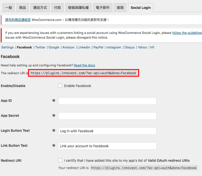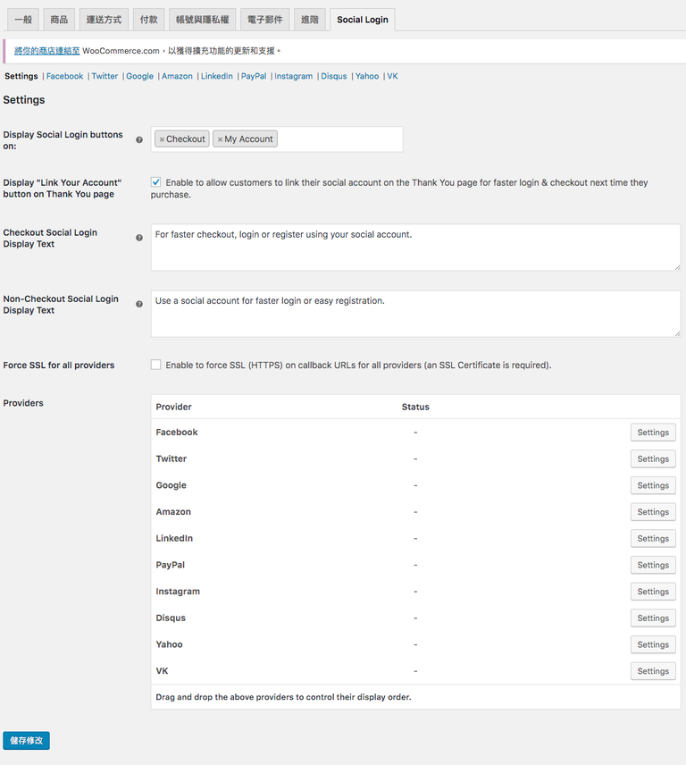 將購買好的 WooCommerce Social Login 安裝到您的 WordPress 網站中,並啟用它。接著到「WooCommerce > 設定 > Social Login」,您就會看到以下的介面: