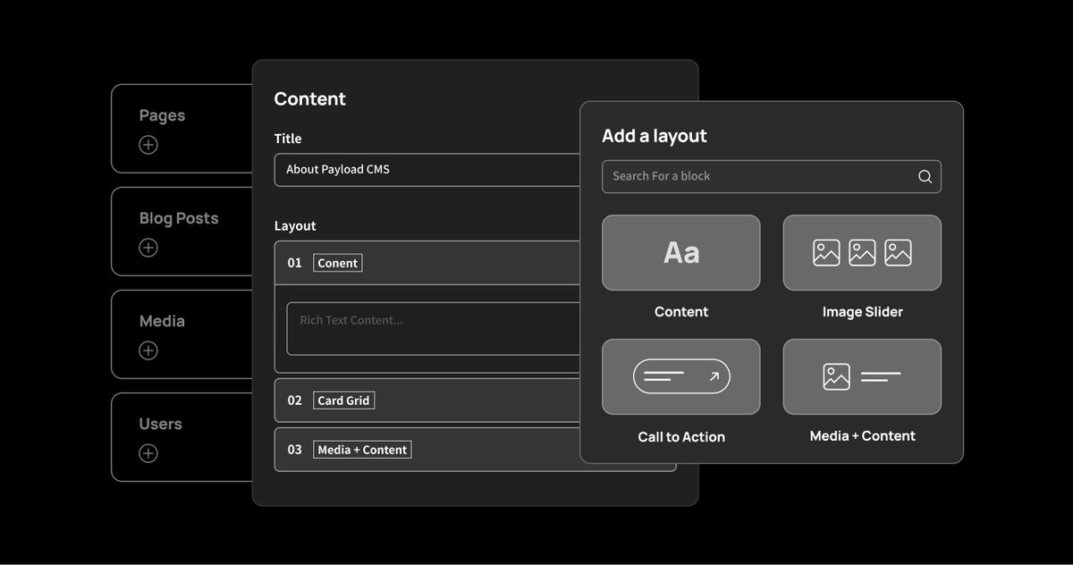 Payload CMS 允許開發者自由設計資料結構,不受固定內容模型限制,適合需要高度自訂內容的網站或應用。透過模組化架構,Payload CMS 也支援深度客製化,讓開發者能擴充功能、建立自訂工作流程,並依專案需求量身打造平台。
