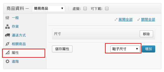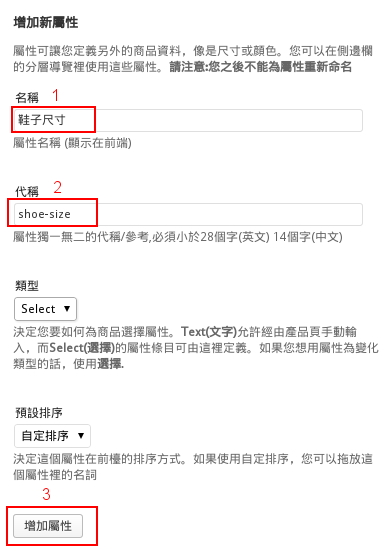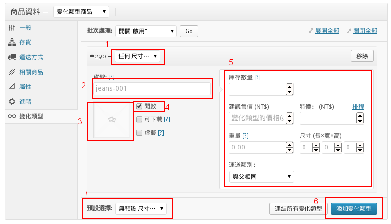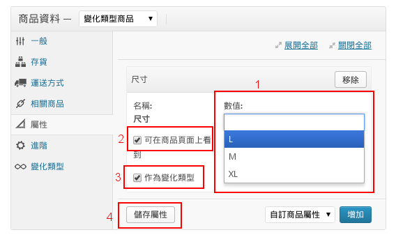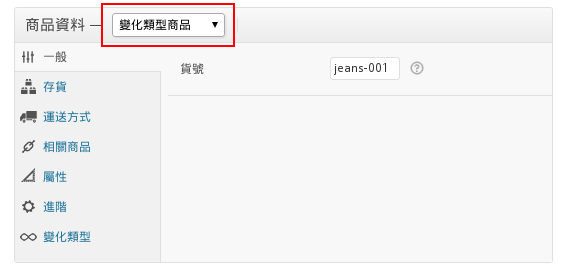 變化類型主要是因為同一個商品可能會有不同尺寸、顏色、價格,所以需要設定不同的參數變化。聽起來跟屬性的設定方法很像,但在這裡多出了不同的延伸貨號、價格。事實上變化類型需要與屬性的設置作配合,如果在大量的商品的時候,能有預設的屬性可供選擇,那在輸入資料上面會比較方便許多。