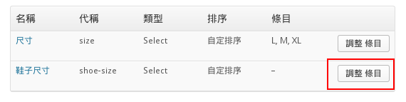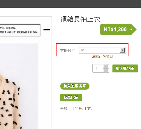設置完成後記得按右上角的更新,商品頁面上就出現可選擇不同的尺寸的選單