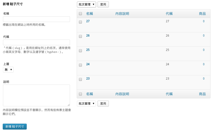 這裡以尺寸為例,在新增商品裡面,選擇變化類型商品後除了貨號以外其它選項都會消失,在左下角會多出一個變化類型