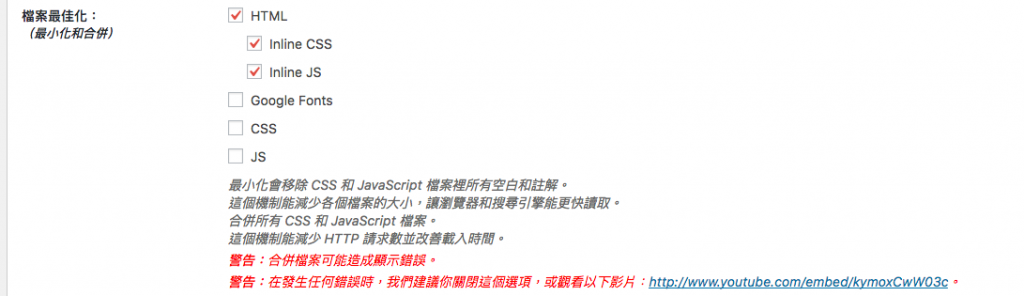 這是在基本選項下面,基本上他可以自動將您的 HTML 跟 javascript 還有 css 檔案最小化以及合併/壓縮,這樣可以減少您網站檔案的大小,除了可以增加 Google 評分之外,也減少使用者瀏覽網站需要使要到的頻寬以及下載速度。