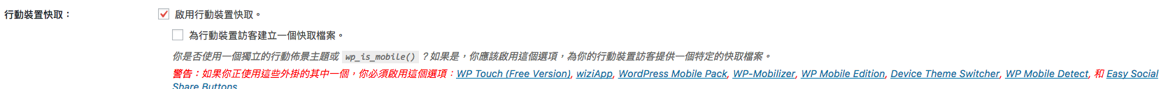 這個基本上我們是建議把它勾取起來,讓行動裝置使用者也可以得到較好的瀏覽經驗,通常一般的主題都是用 RWD 來設計網站所以不會有什麼問題,但是如果您使用的外掛或是套版有使用到為行動裝置特別做不同的版面配置的話,那你可能要加勾“為行動裝置訪客建立一個快取檔案”。下面是我們的建議設定: