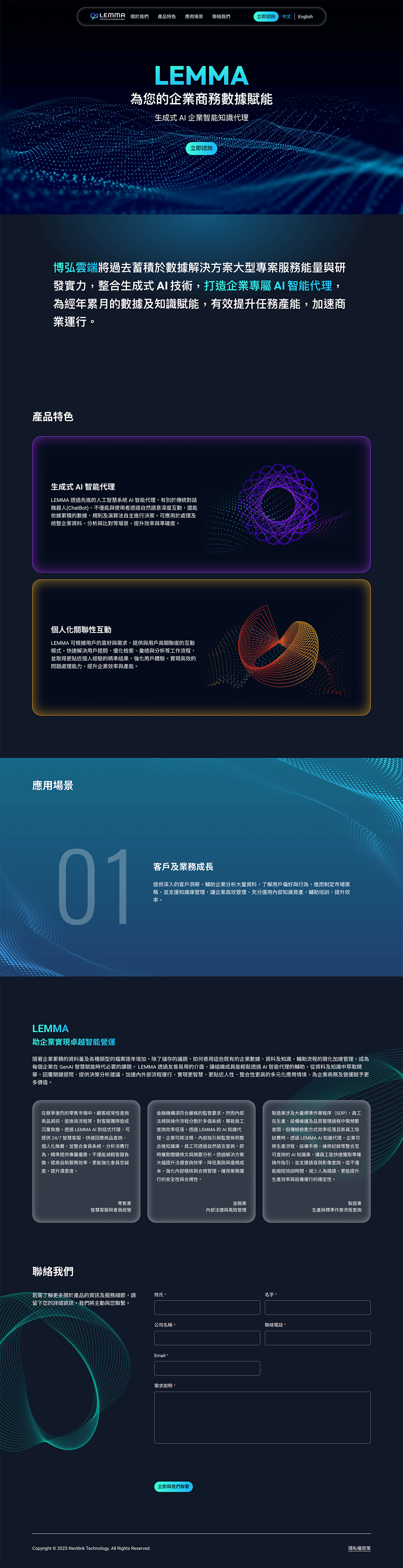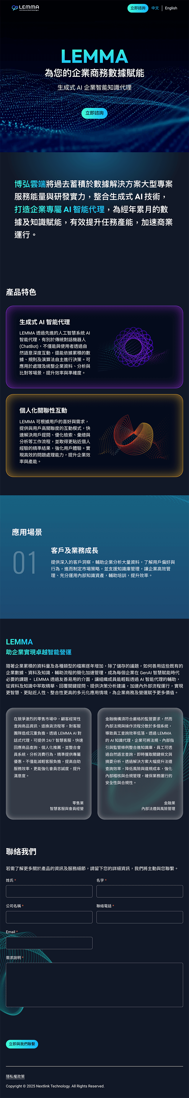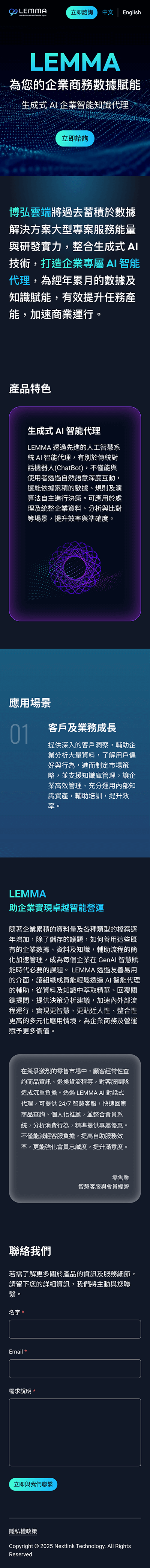 本次專案為 Netlink 推出的生成式 AI 產品 LEMMA® 製作品牌形象網站。 LEMMA® 以自然語意搜尋與 AI 代理技術為核心,致力於協助企業更有效運用內部數據與知識資產,推動智慧化應用與決策效率的提升。 在設計上,因創延續 LEMMA®「以 AI 為企業數據賦能」的理念,運用流動線條與節點圖形象徵資料連結,搭配深色基調與漸層光感,營造出專業且具未來感的科技氛圍。 互動體驗則以層次滑動與元素浮動呈現,呼應產品的智能特質與資料處理能力,讓使用者在瀏覽過程中,感受到如同與智慧系統對話般的自然節奏與沉浸感。