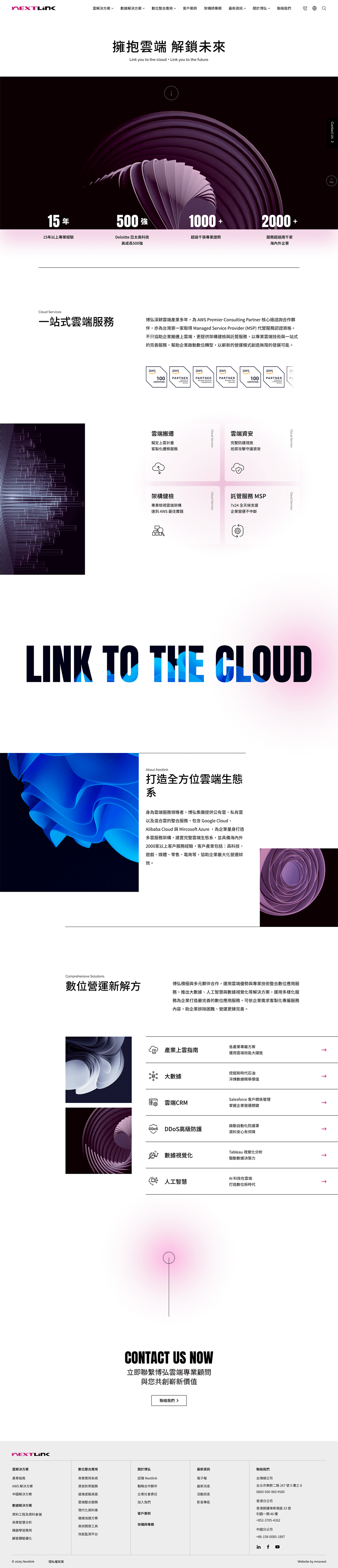 博弘雲端科技擁有多平台認證架構師及國內外經驗豐富的團隊,為企業提供專業、多元且全球化的雲端解決方案與託管服務。 發想自博弘雲端科技的 Tagline "Link to the Cloud",我們利用博弘雲端品牌色的漸層展現抽象的雲端空間意境,並利用帶有 Scrolling Effects 的動態線條示意 Data 與空間的連結,帶出博弘雲端科技的服務 — 經由博弘雲端串起其企業客戶與用戶間的連結。 為了系統化地展示博弘雲端的各種雲端解決方案服務內容,因創科技為博弘雲端科技客製設計了多種模組,並融合網頁互動效果,不僅充分滿足博弘雲端官網大量資訊的呈現,更提供使用者耳目一新的瀏覽體驗。