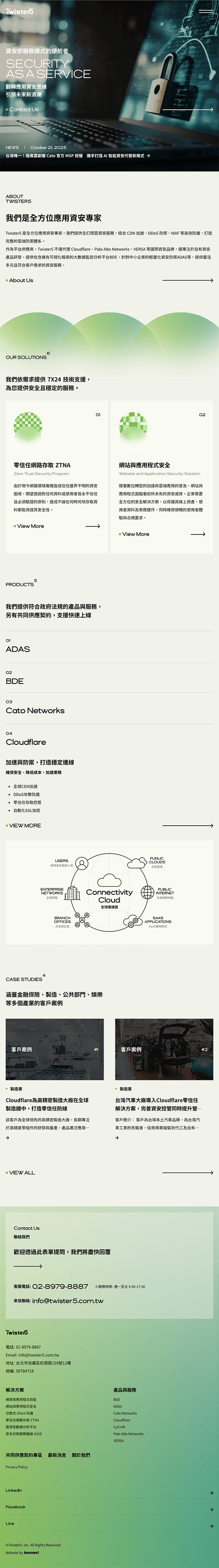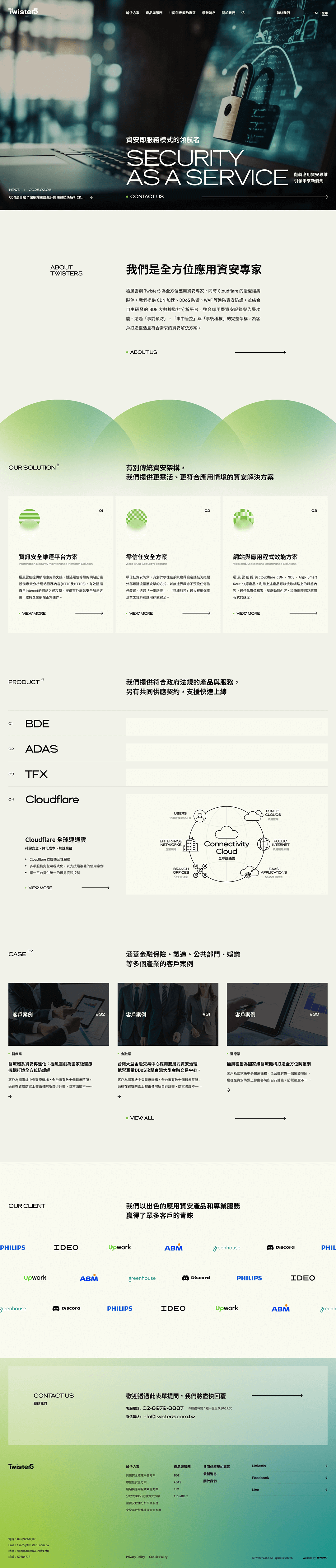 Twister5 是全方位應用資安專家,整合多家全球資安與雲端解決方案領導品牌,協助企業強化防護機制、提升系統韌性,並確保在混合雲、多雲架構下的資訊安全與管理效率。 本專案以「可信任的雲端守護者」為設計主軸,透過多層次資訊架構與模組化設計清楚呈現 Twister5 的服務優勢與合作生態,並以品牌綠為主色系延伸,搭配柔和漸層與滑動動效,營造穩定且專業的視覺感受。 為了強化資訊傳遞效率與用戶體驗,我們設計了具導向性的視覺流程與圖像化服務架構說明,搭配圖文整合、數據圖表、合作品牌區塊等元素,有效提升資訊吸收與閱讀動線,同時建立 Twister5 專業可信的品牌印象。